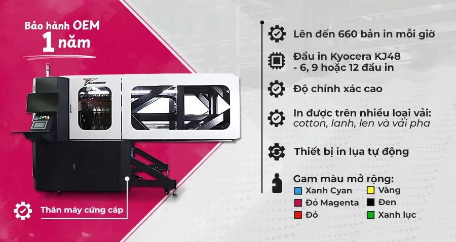 - Tiết kiệm chi phí: Không cần vận hành hai hệ thống riêng biệt. Máy in hybrid DTG có thể xử lý đa dạng đơn hàng trên cùng dây chuyền.