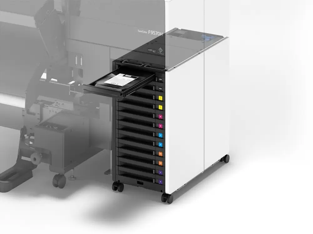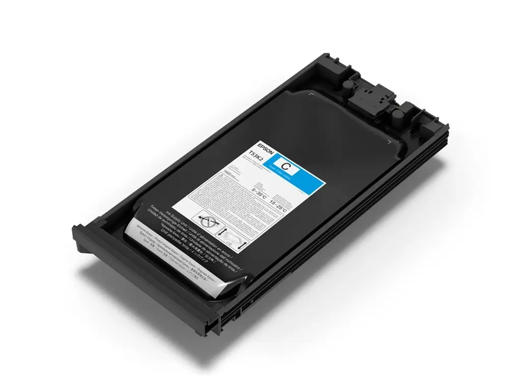 Hai bộ mực Epson UltraChrome® DS CMYHDK và một bộ mực huỳnh quang / mực màu mở rộng trong các gói mực 1,6 lít dung tích.